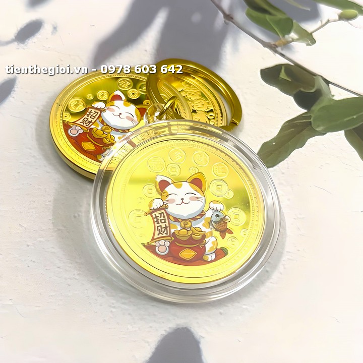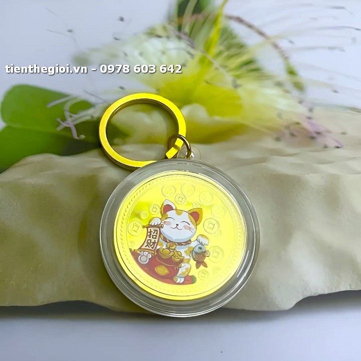 Móc khóa xu lưu niệm Mèo Thần Tài mạ vàng in màu