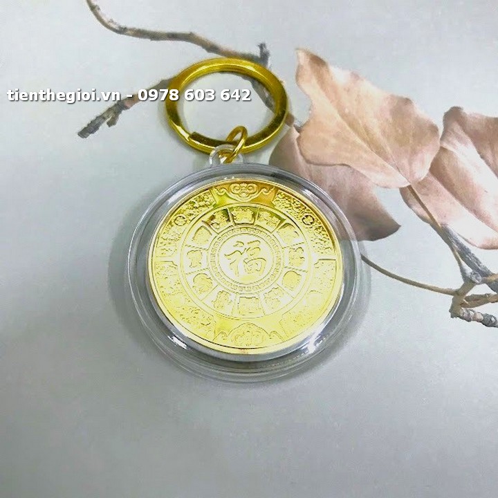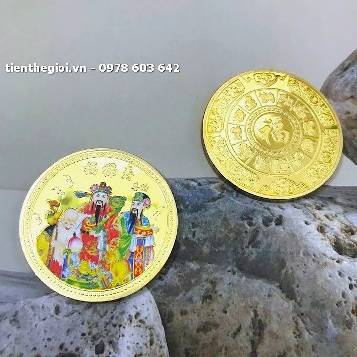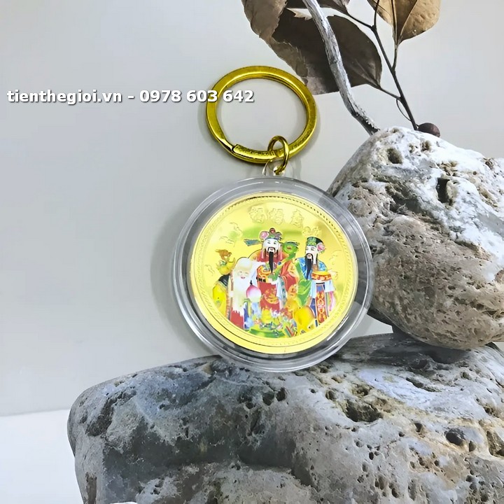 Móc khóa xu lưu niệm Phúc Lộc Thọ mạ vàng in màu