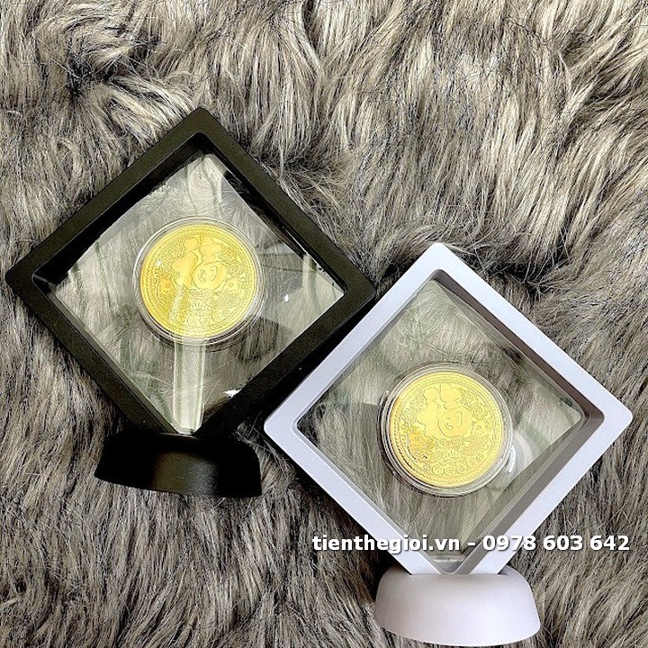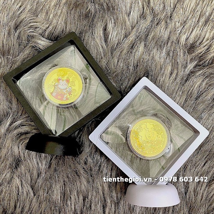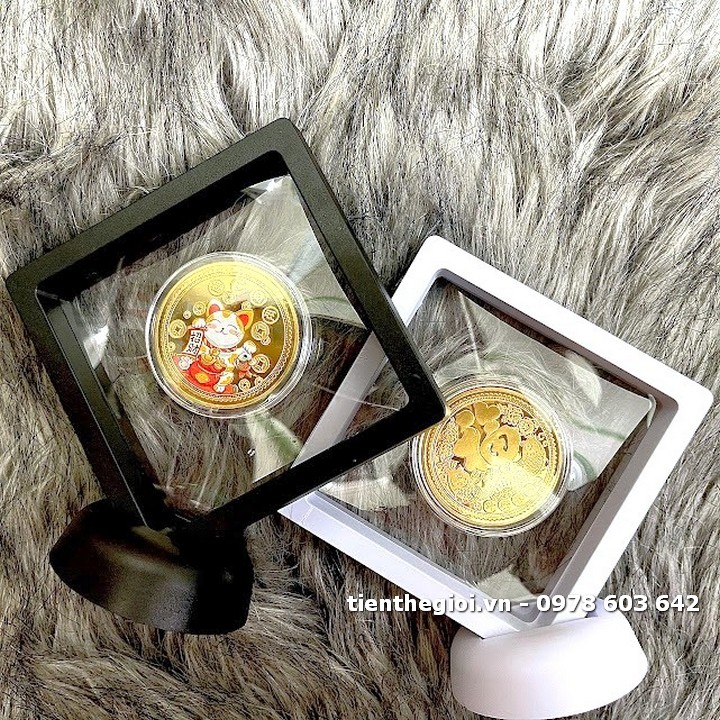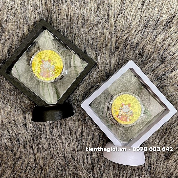 Đóng gói sản phẩm: x1 Khung trưng bày xu lưu niệm Mèo Thần Tài mạ vàng in màu