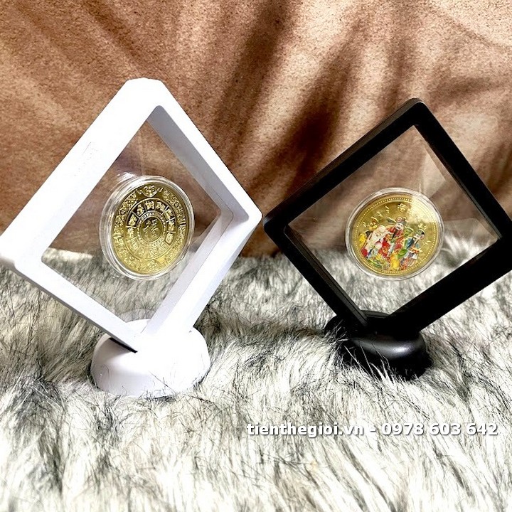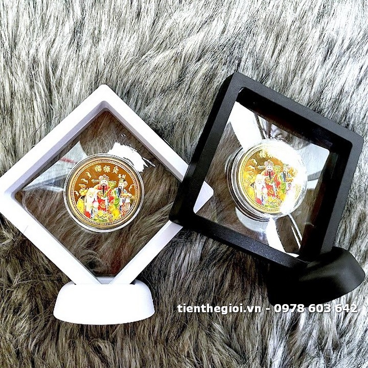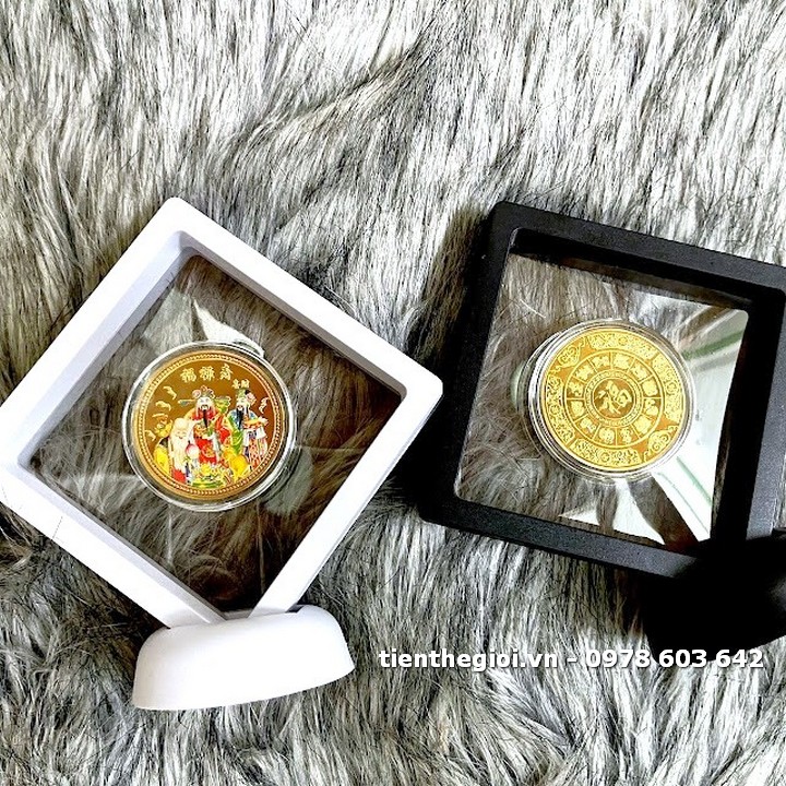 Đóng gói sản phẩm: x1 Khung trưng bày xu lưu niệm Phúc Lộc Thọ mạ vàng in màu