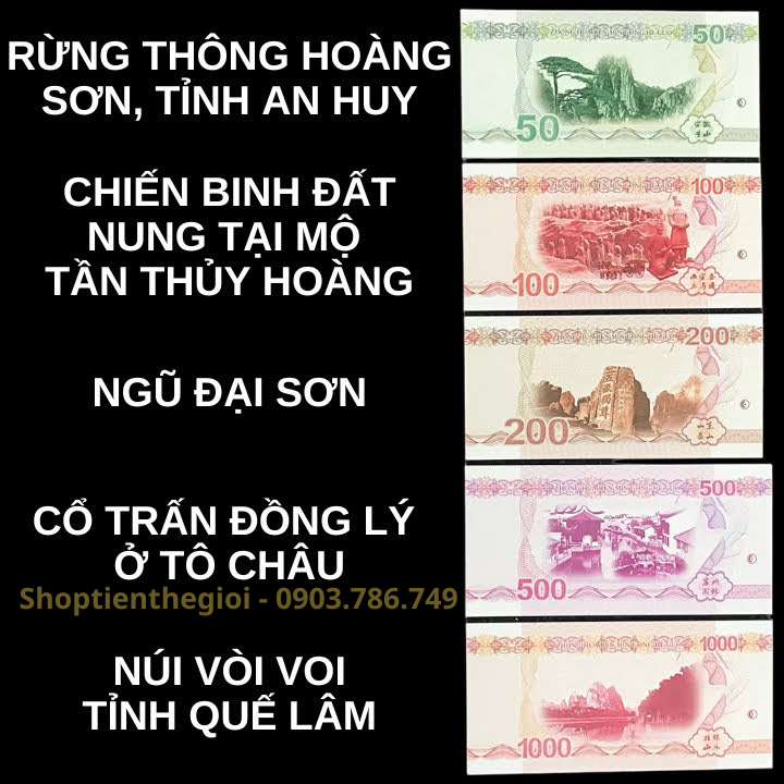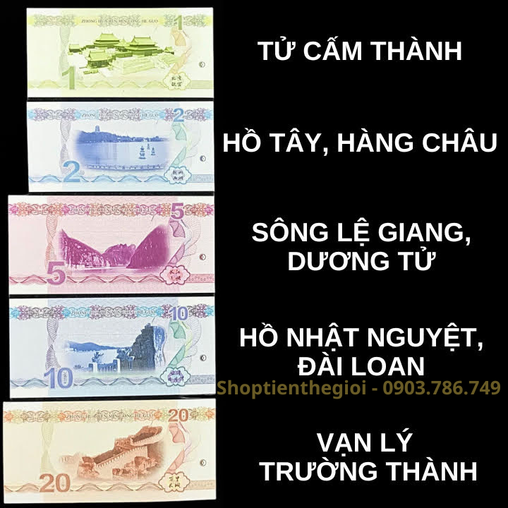 Mô tả sản phẩm: Bộ gồm 10 tờ tiền lưu niệm, có mặt trước của từng tờ là hình các danh lam thắng cảnh nổi tiếng ở Trung Quốc. Mặt sau là hình rồng với những kiểu dáng, màu sắc và mệnh giá khác nhau trên mỗi tờ tiền khi được soi dưới tia UV tím.