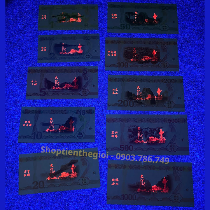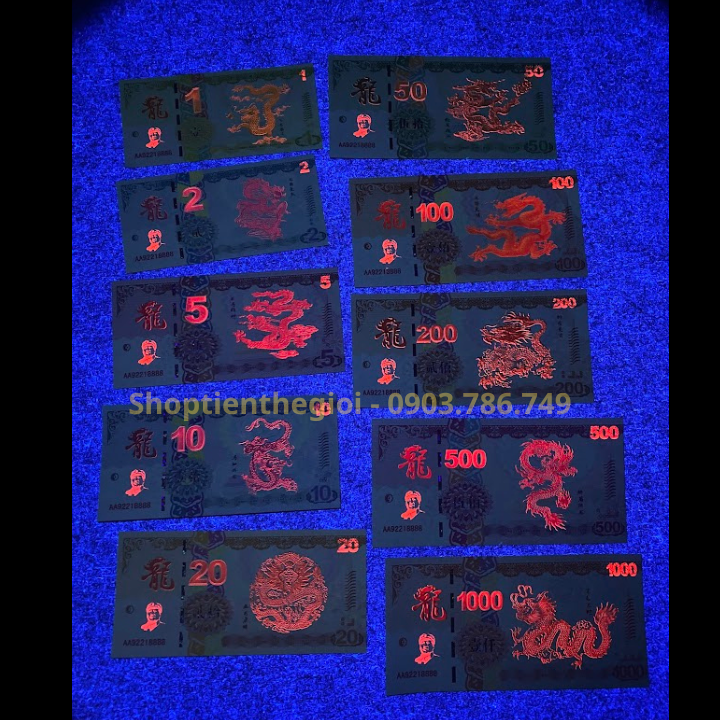 Đặc Điểm Nổi Bật: Bộ 10 Tờ Tiền Hình Con Rồng Dạ Quang có mặt trước là hình các danh lam thắng cảnh nổi tiếng ở Trung Quốc. Mặt sau là hình rồng với những kiểu dáng, màu sắc và mệnh giá khác nhau trên mỗi tờ tiền. Rồng là một trong những thần thú rất được thờ phụng trong văn hóa Á Đông với ý nghĩa uy quyền, giàu sang, phú quý, giúp mang lại may mắn cho người sở h Ngoài mặt nổi tờ tiền còn có các hình ảnh dạ quang chìm độc đáo, thú vị khi được chiếu dưới tia UV tím.