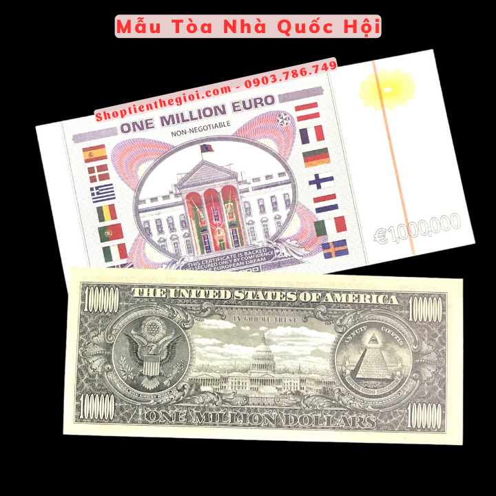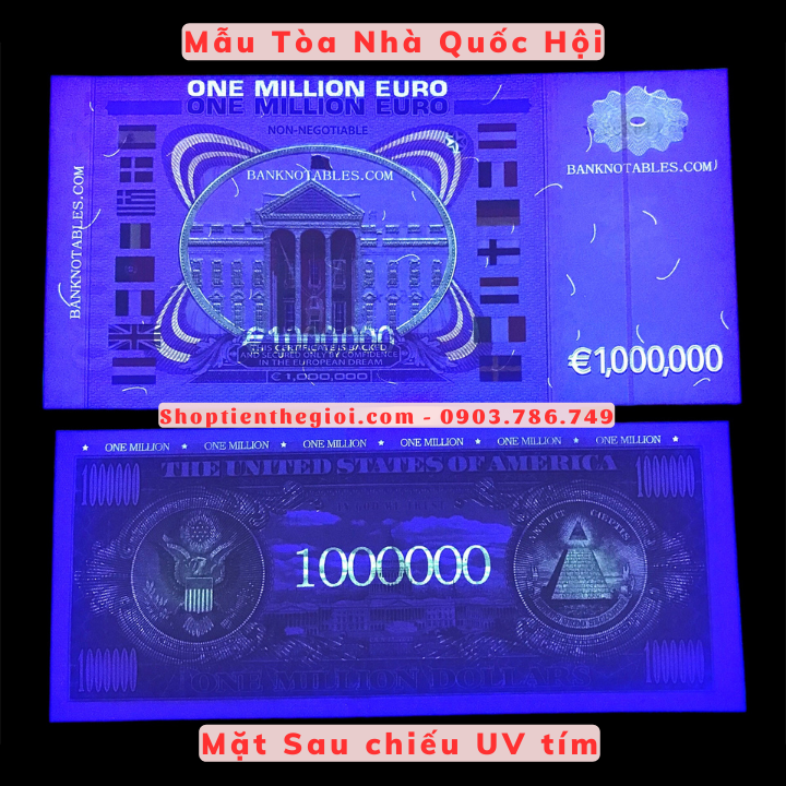 Đặc Điểm Nổi Bật: Cặp Tiền Lưu Niệm 1 Triệu USD Và Euro Dạ Quang gồm 2 tờ: Tiền lưu niệm 1 triệu USD Toà Nhà Quốc Hội dạ quang và Tiền lưu niệm 1 triệu EURO dạ quang... đồng thời những tờ tiền còn có mệnh giá lớn nên thường được dùng làm vật sưu tầm, bỏ túi lấy hên. Ngoài những hình in nổi, bộ tiền còn có những hình dạ quang chìm chỉ hiện lên khi được chiếu bằng tia UV tím. Tiền cũng rất thích hợp làm quà tặng cho người thân, bạn bè.