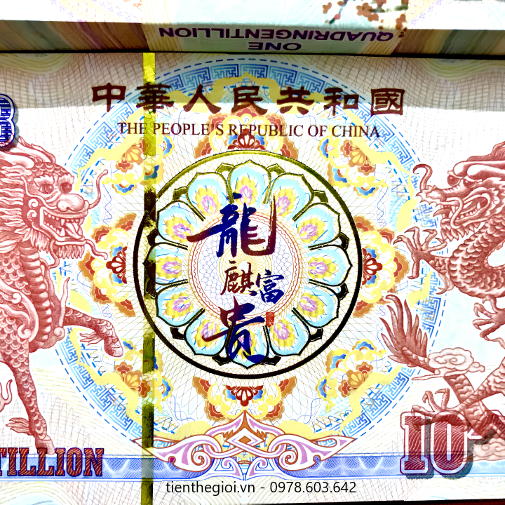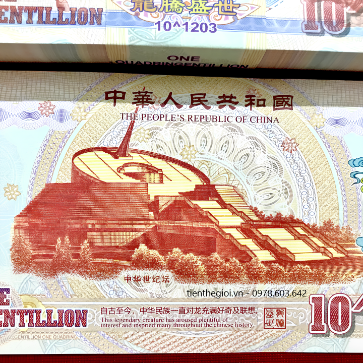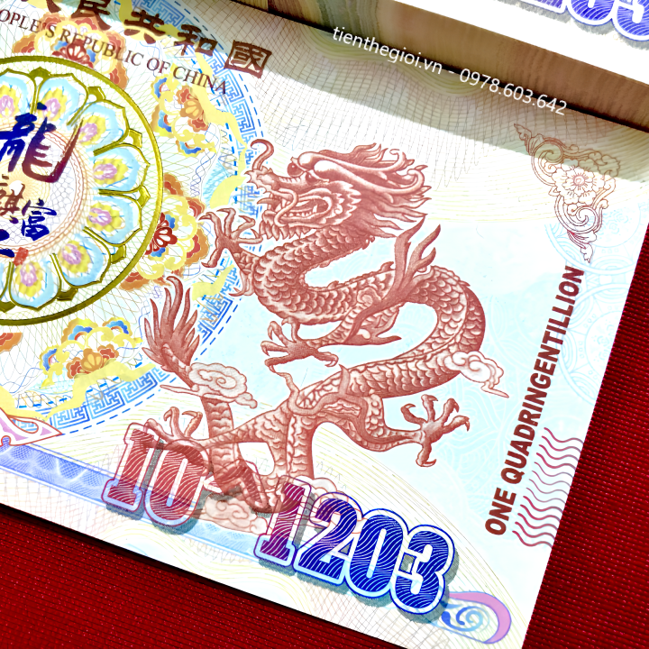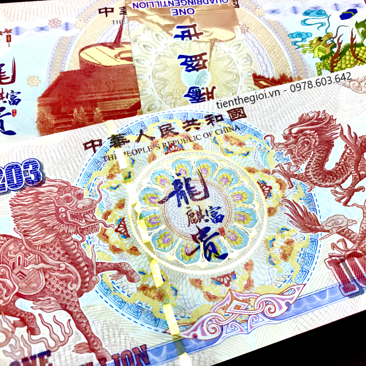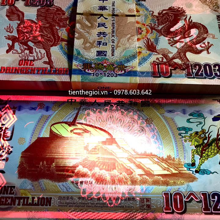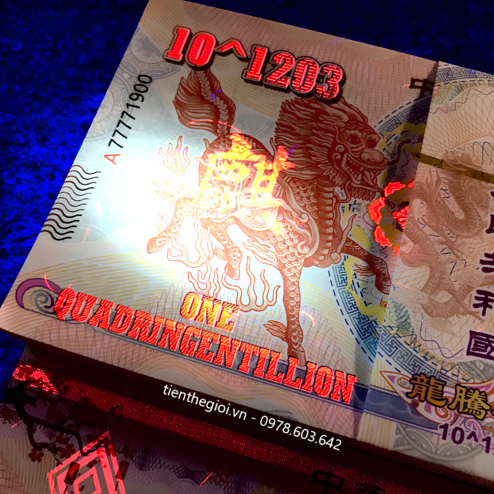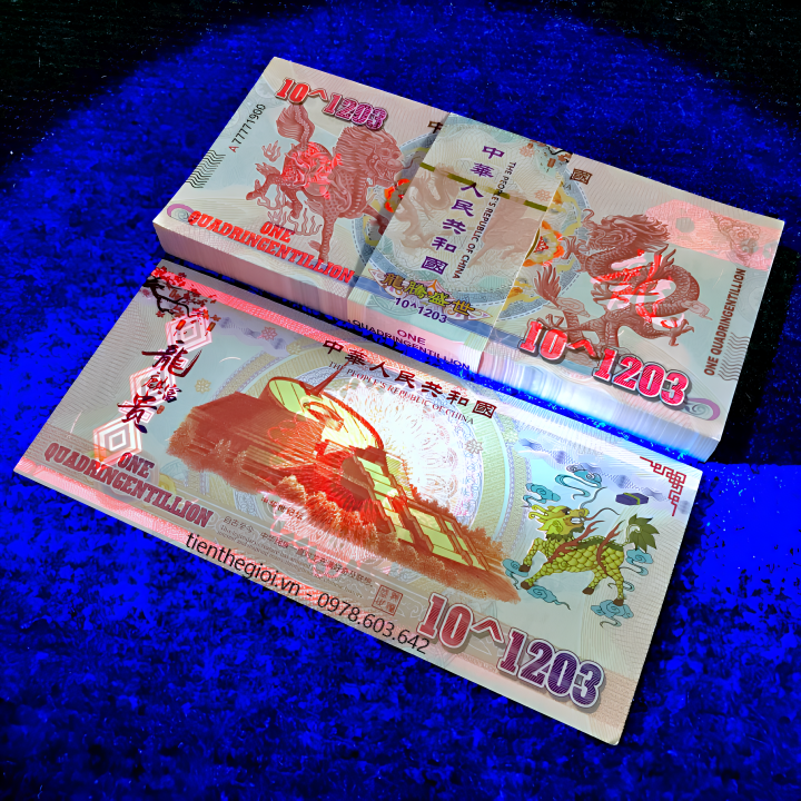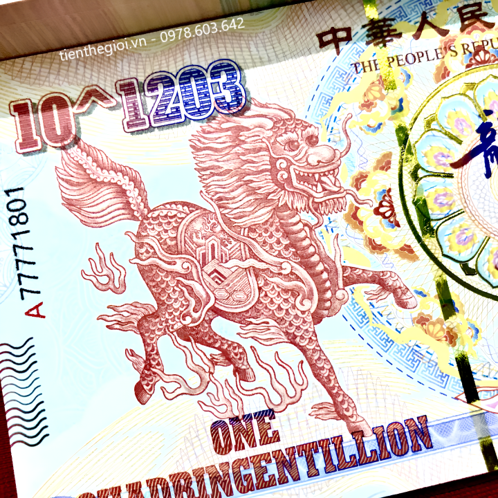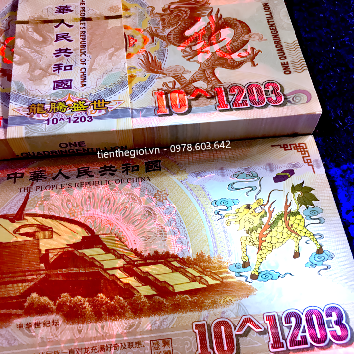 Mô tả sản phẩm: Tiền Lưu Niệm 10^1203 Hình Long Lân có chất liệu giấy. Mặt trước tờ tiền là hình con lân bên trái, hình con rồng bên phải, giá trị tiền ở các cạnh viền. Mặt sau là hình đài tưởng niệm Thiên niên kỷ, có hình con lân màu vàng bên tay phải, cùng giá trị 10^1203 được viết bằng số.