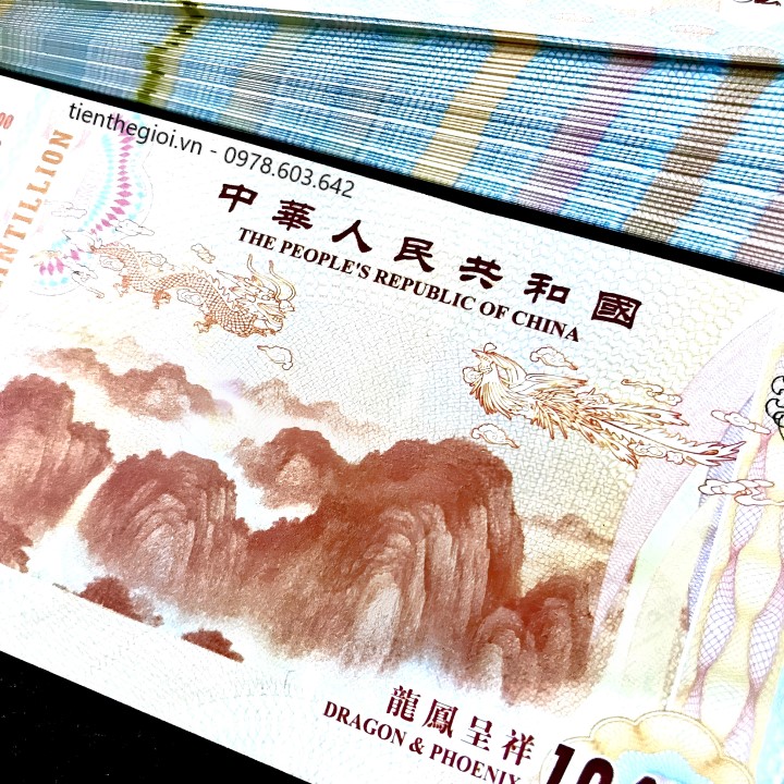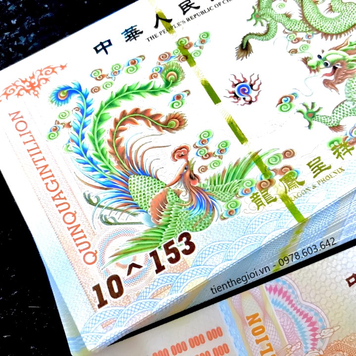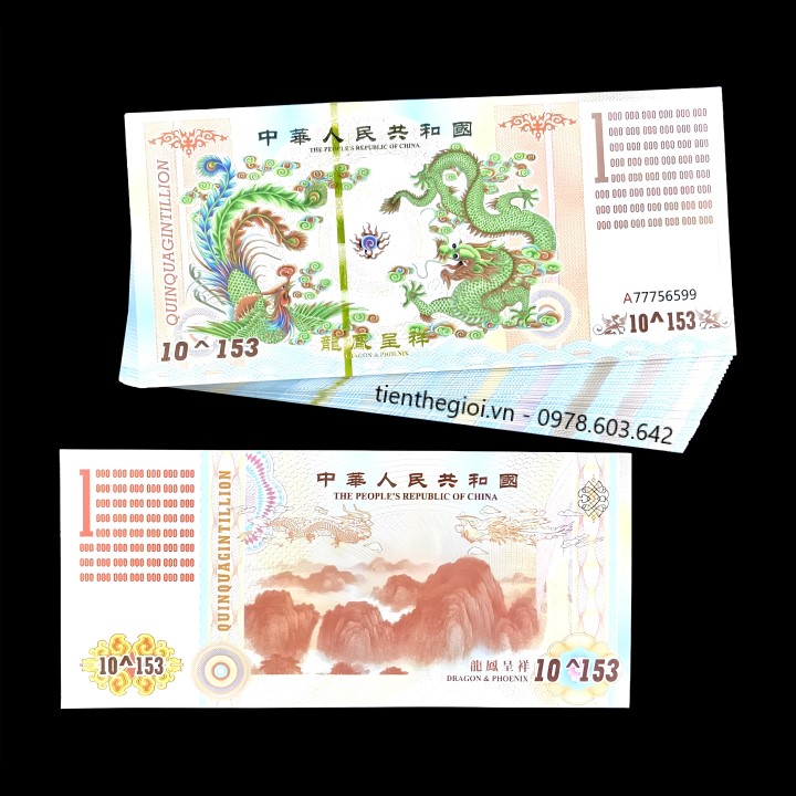 Mô tả sản phẩm: Tiền Lưu Niệm 10^153 Hình Long Phụng có chất liệu giấy. Mặt trước tờ tiền là hình con rồng bên phải, chim phượng hoàng bên trái, giá trị tiền ở các cạnh viền. Mặt sau là hình núi và thác, có rồng và phượng bay phía trên, cùng giá trị 10^153 được viết bằng số.
