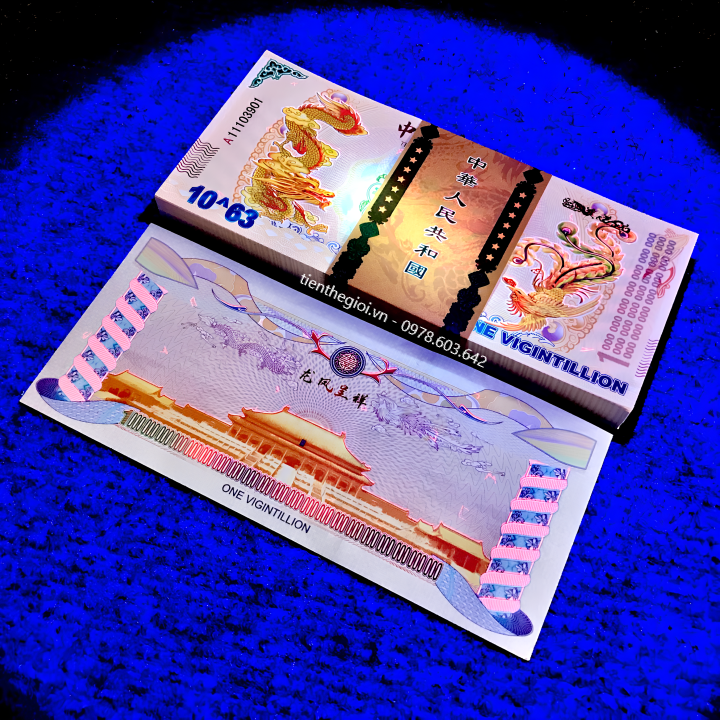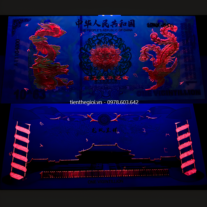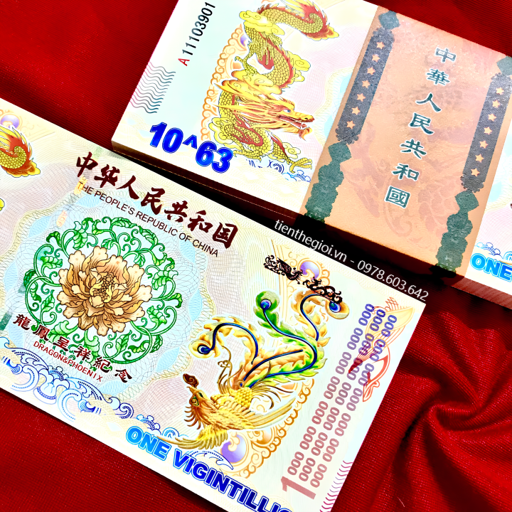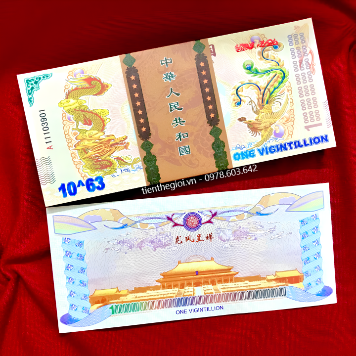 Mô tả sản phẩm: Tiền Lưu Niệm 10^63 Hình Long Phụng có chất liệu giấy. Mặt trước tờ tiền là hình con rồng bên trái, chim phượng hoàng bên phải, giá trị tiền ở các cạnh viền. Mặt sau là hình tử cấm thành, có rồng và phượng bay phía trên, cùng giá trị 10^63 được viết bằng số.
