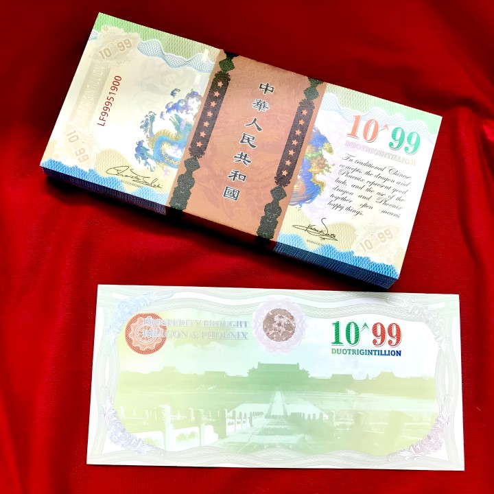Mô tả sản phẩm: Tiền Lưu Niệm 10^99 Hình Long Phụng có chất liệu giấy. Mặt trước tờ tiền là hình con rồng và chim phượng hoàng uốn lượn, giá trị tiền ở các cạnh viền. Mặt sau là hình tử cấm thành, có giá trị 10^99 được viết bằng số.