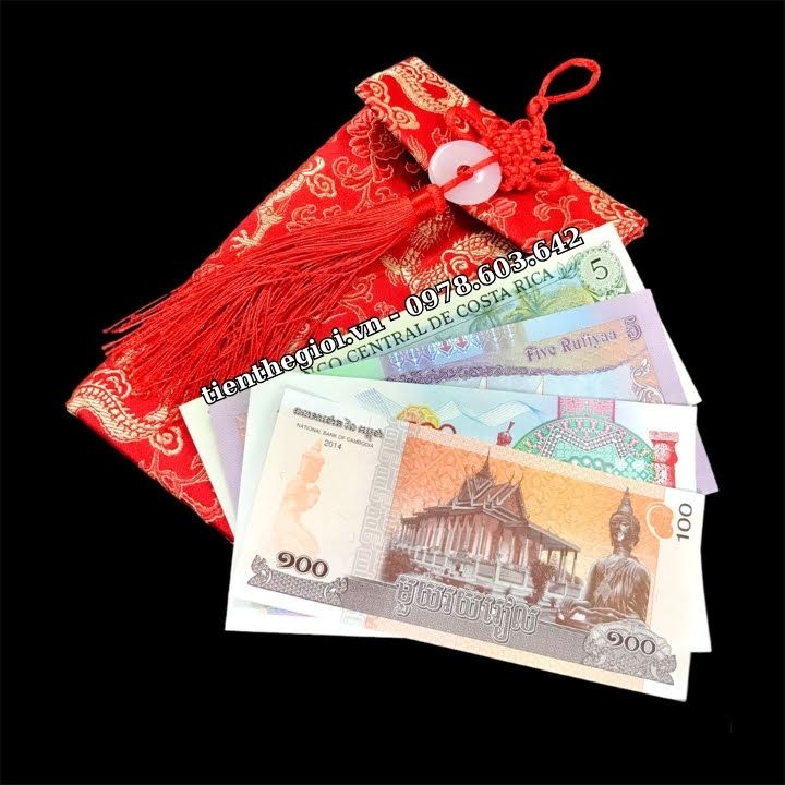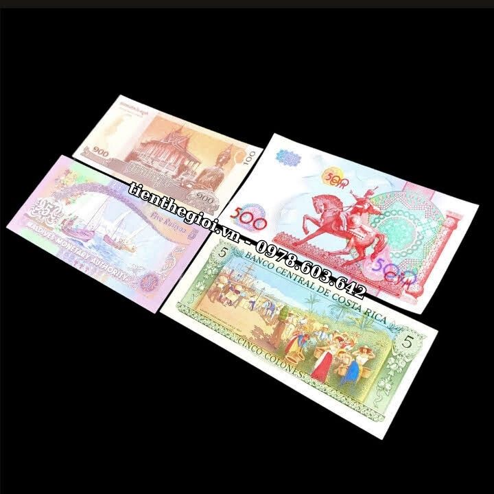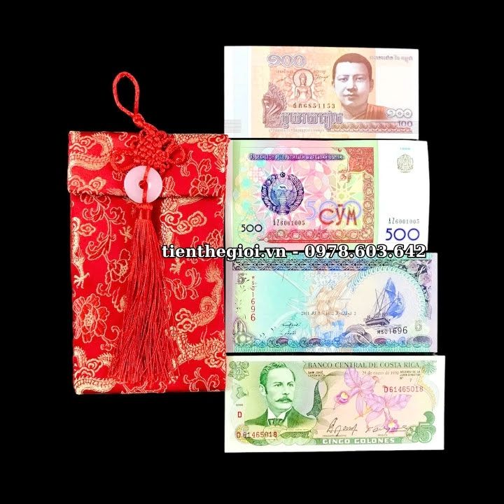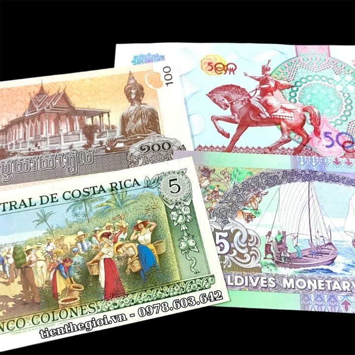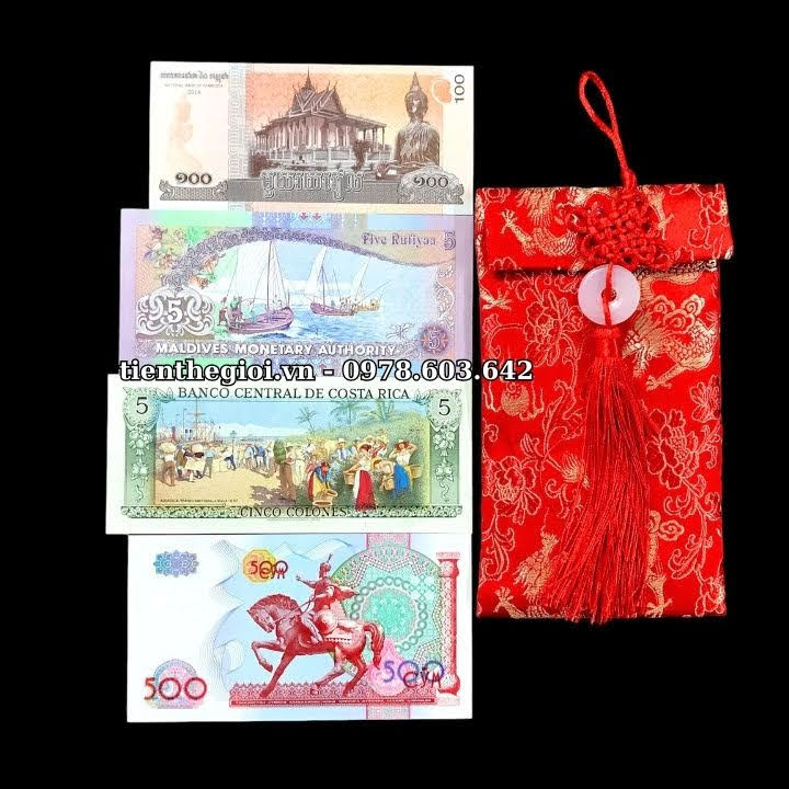 Đặc điểm nổi bật: Tờ Maldives 5 Rufiyaa với màu sắc chủ đạo là tím hồng rất hài hòa, cùng hình ảnh những người ngư dân đang căng buồm ra khơi, như một câu chúc mang lại sự thuận buồm xuôi gió, dành cho những người đi làm, đang trên con đường tìm kiếm công danh sự nghiệp; Tờ Campuchia 100 riels với màu vàng cam là màu chủ đạo, tờ tiền có hình Đức Phật và ngôi chùa vàng linh thiên, mang ý nghĩa đem đến sự bình an; Tờ Costa Rica 5 Colones có hình ảnh trên tờ tiền là cảnh họp chợ, mua bán, sung túc tấp nập, như một lời chúc mua may bán đắc đến với những người làm ăn, kinh doanh, mua bán; Tờ Uzbekistan 500 Som có màu đỏ chủ đạo với hình ảnh một chiến binh đang cưỡi ngựa phi nước đại, mang ý nghĩa mã đáo thành công, cho những ai đang trên con đường chinh phục mục tiêu của mình. Bộ tiền mang đầy ý nghĩa này, sẽ là một món quà vô cùng tuyệt vời để dành tặng cho đối tác, người thân, bạn bè...