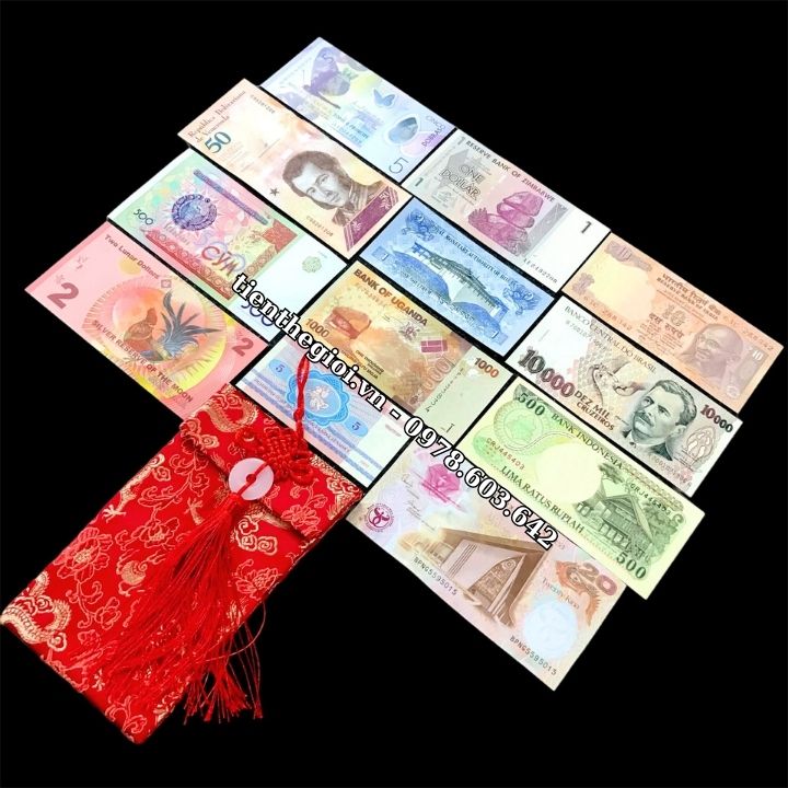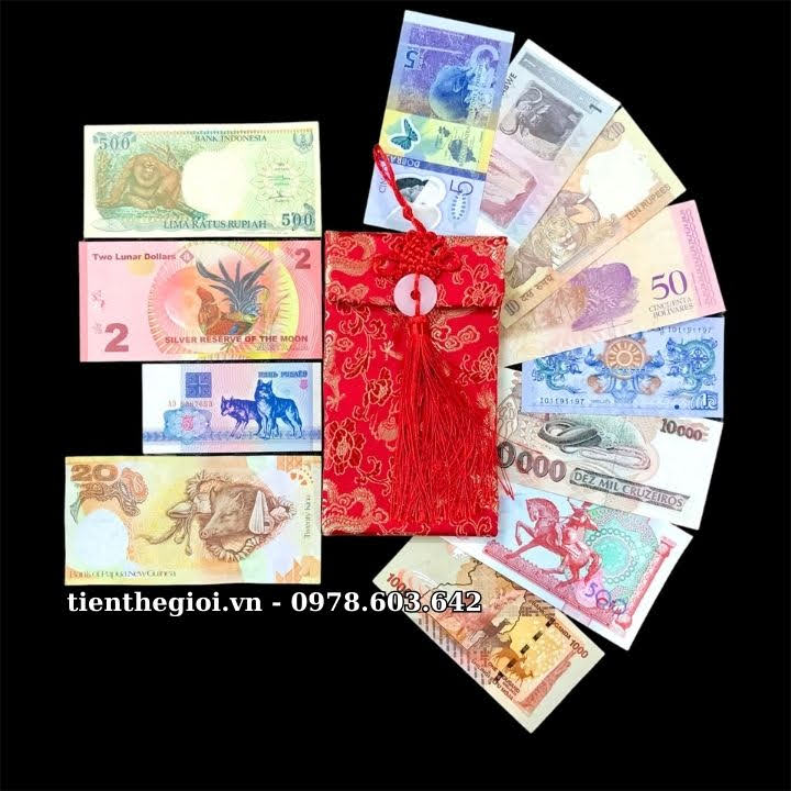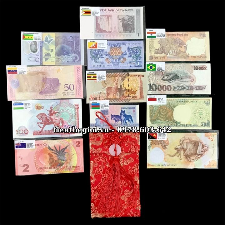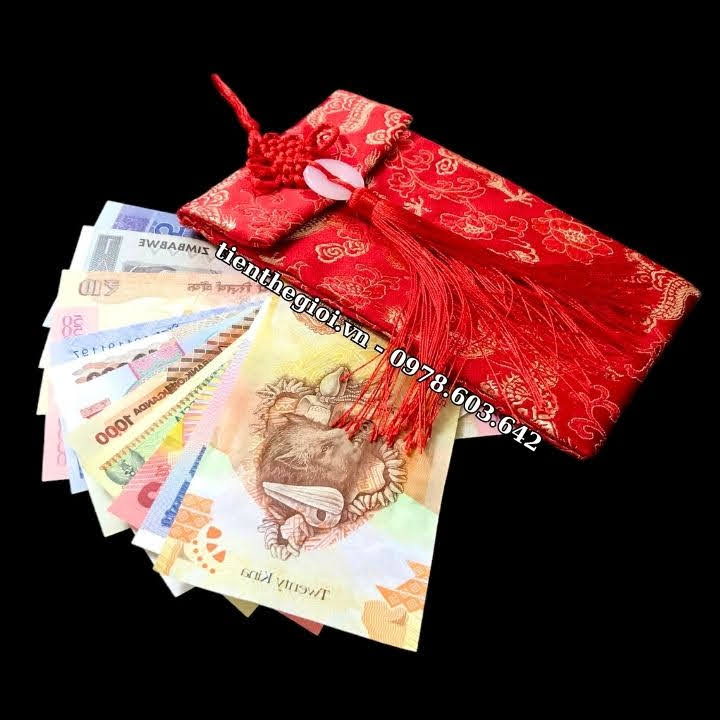 Bộ tiền được dán cờ theo nước và tặng kèm 1 túi gấm đỏ sang trọng