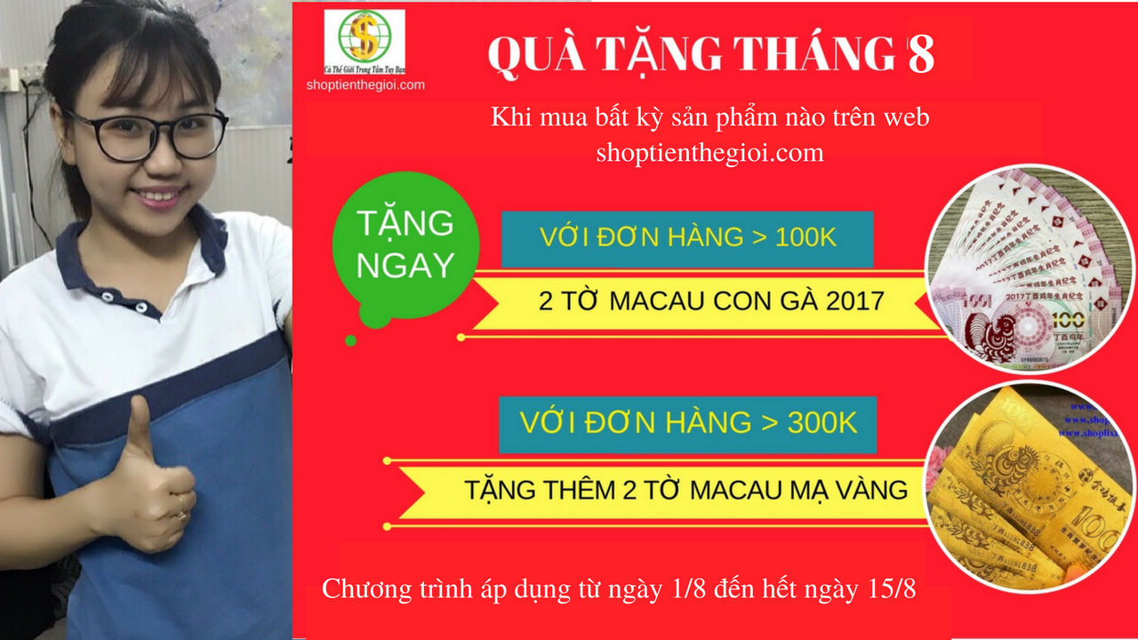 - Với đơn hàng từ 300k trở lên khách hàng sẽ được tặng 2 TỜ TIỀN CON GÀ MACAU và 2 TỜ TIỀN CON GÀ MACAU MẠ VÀNG cực đẹp may mắn cho năm 2017