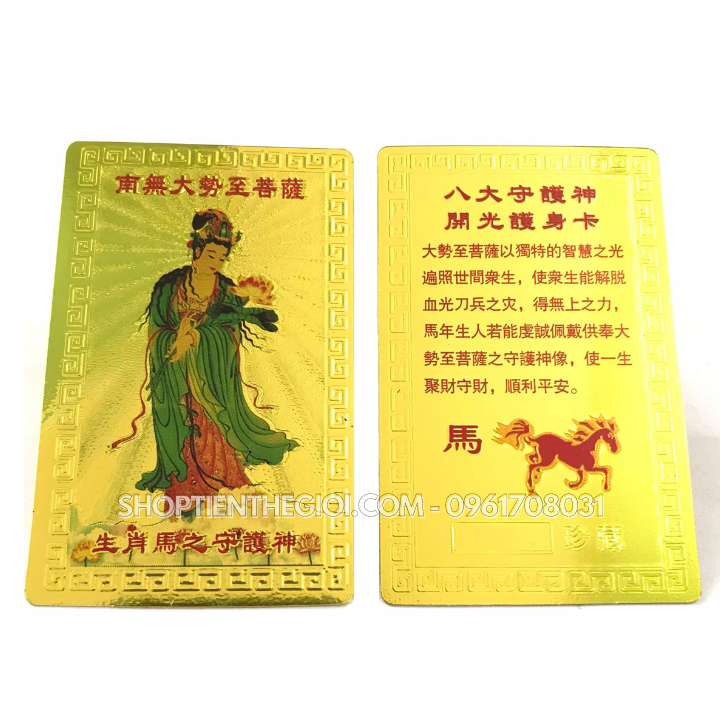 - Đóng gói sản phẩm : x1 Thẻ Kim Bài Phật Bản Mệnh Tuổi Ngọ – Phật Đại Thế Chí Bồ Tát